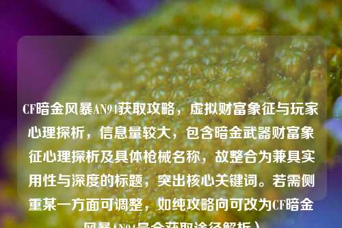 《CF暗金武器:虚拟财富象征与玩家心理探析》 ,在《穿越火线》(CF)中,暗金武器(如暗金风暴AN94)不仅是强力装备,更成为玩家身份与财富的虚拟象征,其独特的暗金外观和稀有属性,激发了玩家的收藏欲和竞技优越感,获取方式通常通过限时活动、抽奖或氪金途径,高成本投入进一步强化了其“奢侈品”属性,反映了游戏内“付费即特权”的消费心理,玩家对暗金武器的追求,既是对战力的需求,也暗含社交展示与阶层认同的动机,揭示了虚拟世界中经济系统与人性虚荣的复杂互动。